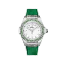 The Hublot Big Bang One Click Joyful Steel Apple Green 33 mm captures the spirit of freshness and vitality. With its stainless steel case and bezel set with vivid green sapphires, this timepiece combines joyful color with refined Swiss craftsmanship. Designed for confident modern women, it radiates playful elegance while offering everyday versatility.