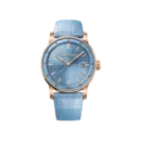 - Dial: Light blue with applied pink-gold hour markers and hands, both with luminescent coating; matching inner flange.