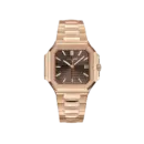 The square silhouette, rose-gold accents and textured brown dial create a unique aesthetic for those who