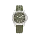 The Patek Philippe Aquanaut Luce 5267/200A-011 is a refined ladies’ sports watch crafted in stainless steel, featuring a vibrant green embossed dial and a dazzling diamond-set bezel. It combines the contemporary spirit of the Aquanaut with elegant jewelry detailing, offering both versatility and luxury.