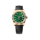 The Sky-Dweller 336238 stands out with its rare green dial paired with a classic yellow gold case, offering a distinctive yet sophisticated look. With dual time capability, an annual calendar, and Rolex’s esteemed movement excellence, this model is highly coveted by collectors seeking both functional complexity and bold design.